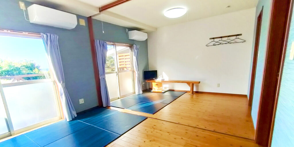 | 和室 | 洋室(12畳) 間仕切りをして個室としてご利用 | 洋室(8畳) シャワー・トイレ・ウッドデッキ付き | |