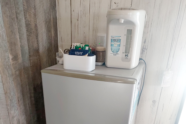 共用で冷蔵庫と湯沸かしポットがご使用できます。インスタントコーヒーもご自由にお使いください。